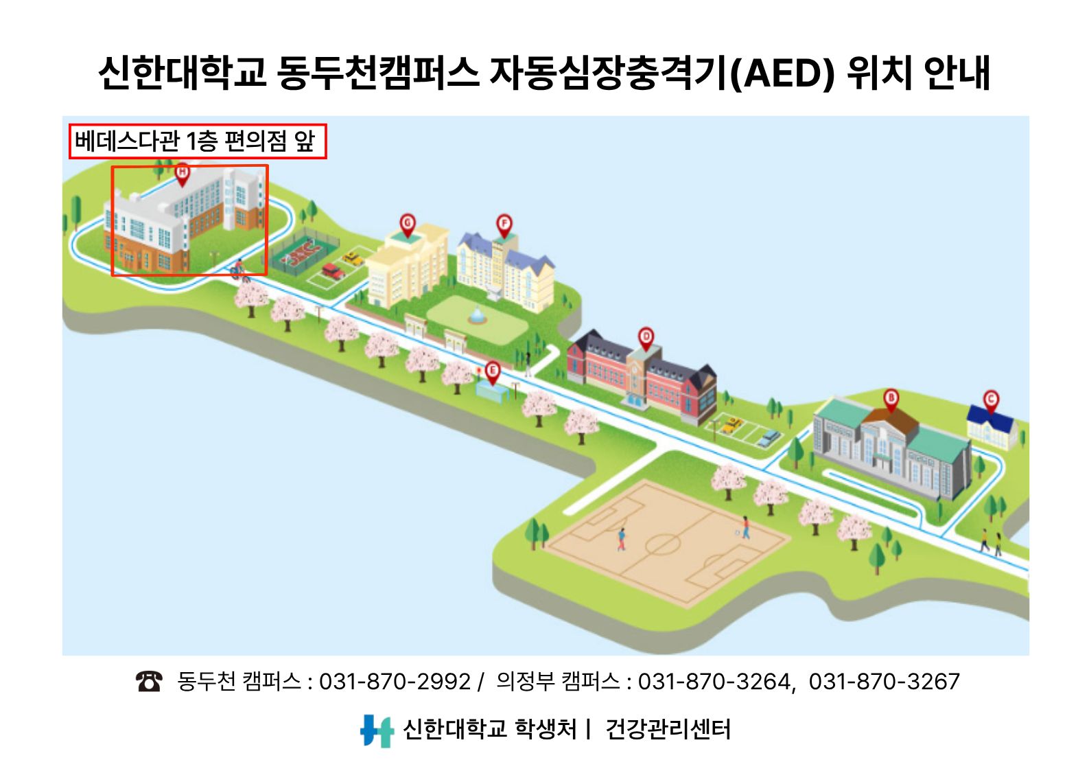 1. 학생처 건강관리센터에서는 교내 응급상황에 대비하여 자동심장충격기(AED)를 설치·운영하고 있습니다.