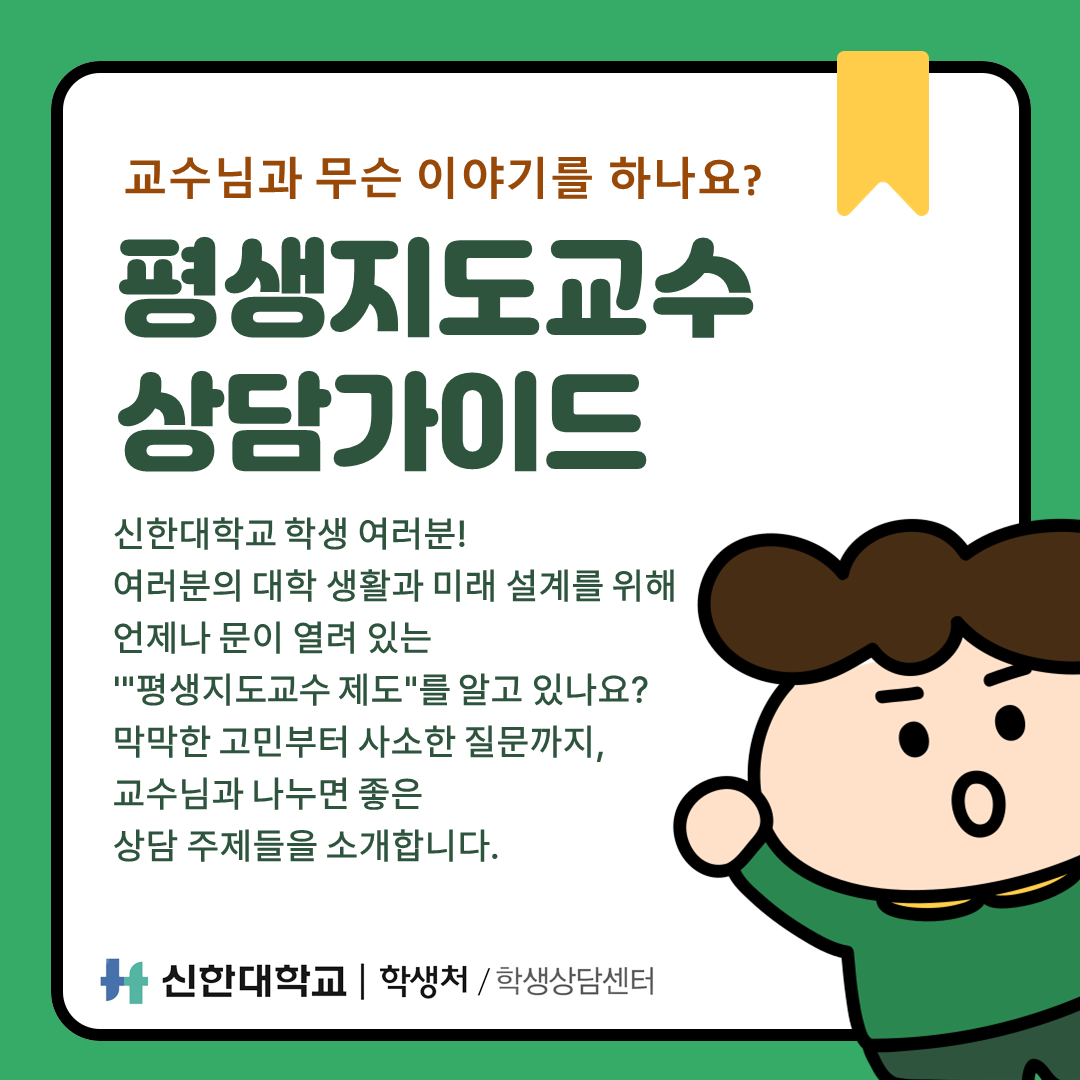 신한대학교 학생 여러분께 평생지도교수 상담가이드를 통해 교수님과 나누면 좋은 상담 주제들을 소개해드립니다:)