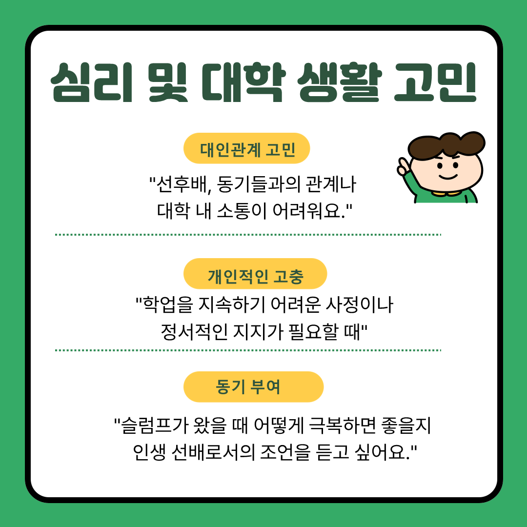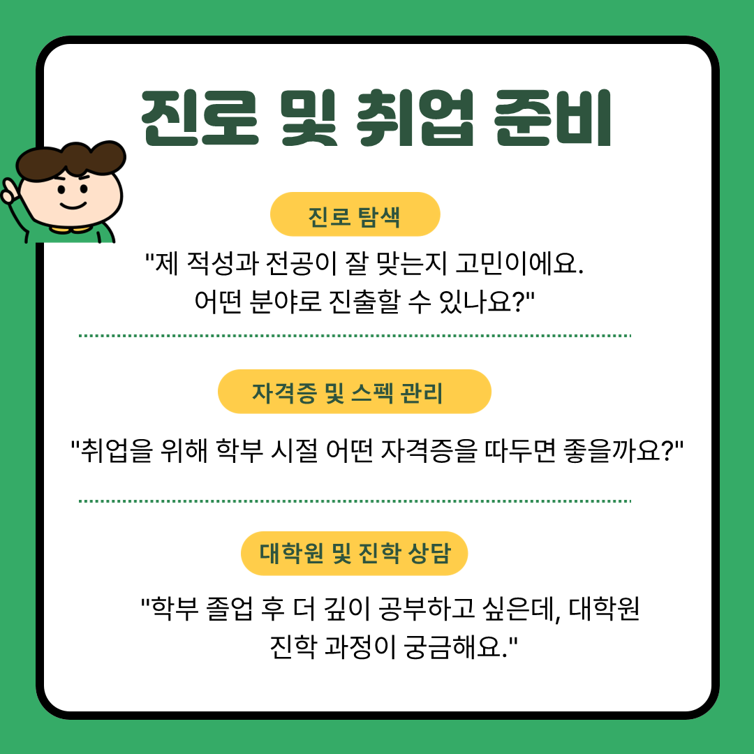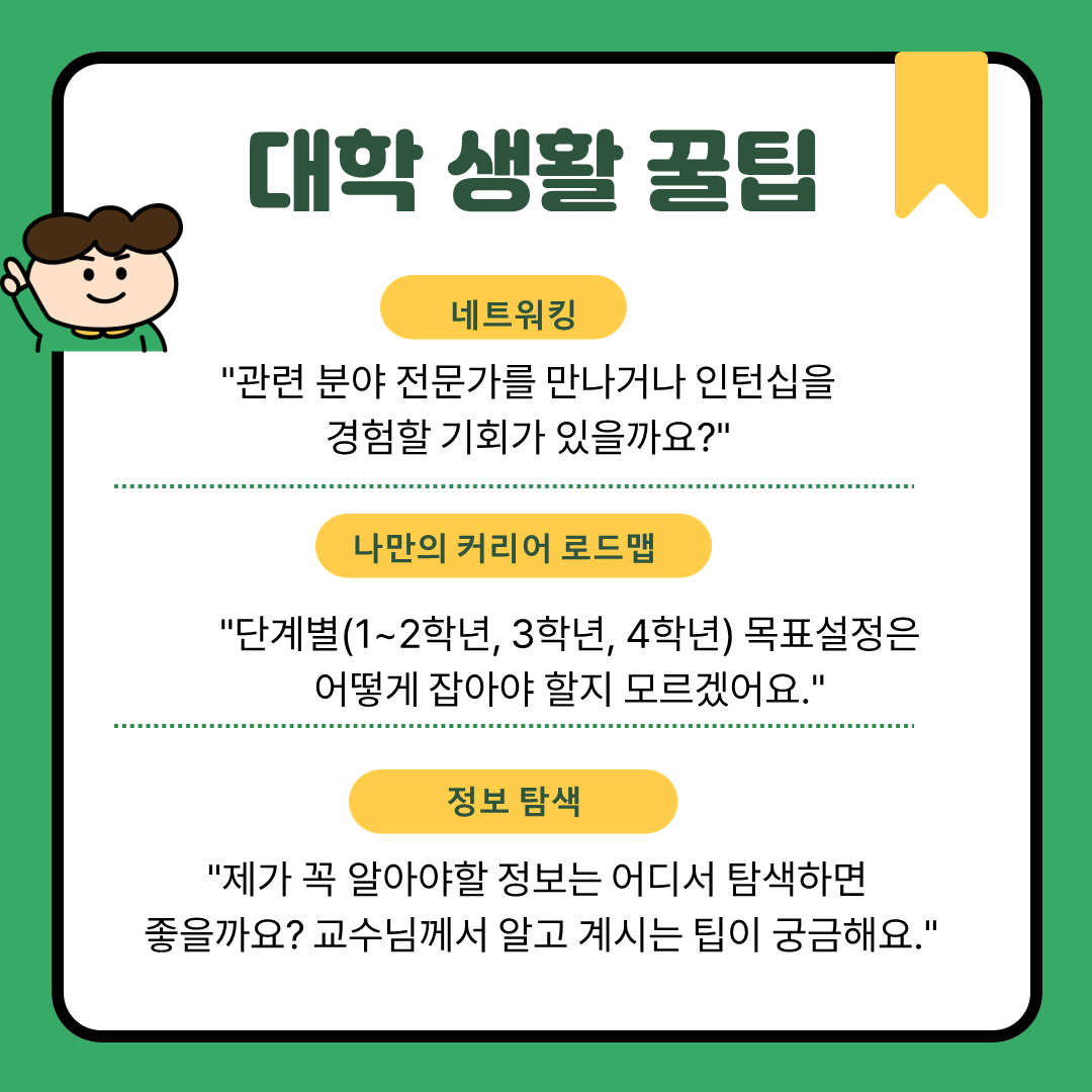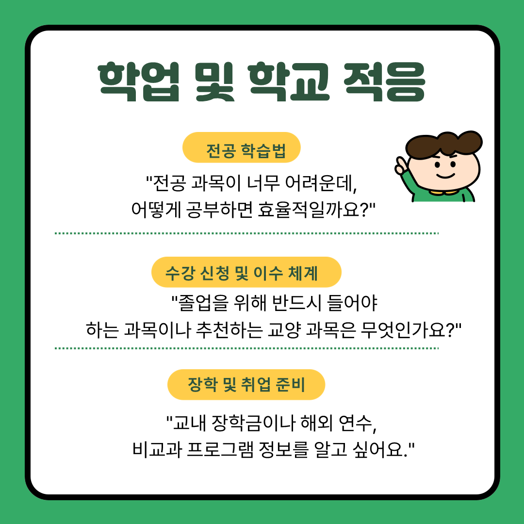 지도교수님과의 상담 전, 어떤 질문을 할지 고민이 된다면 아래의 가이드를 참고해보세요!