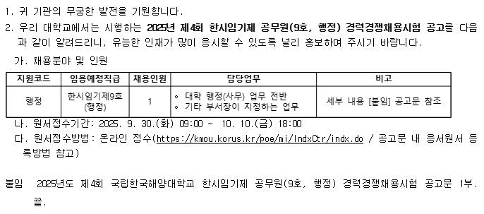2025년 제4회 국립한국해양대학교 한시임기제 공무원(9호, 행정) 경력경쟁채용 공고 홍보